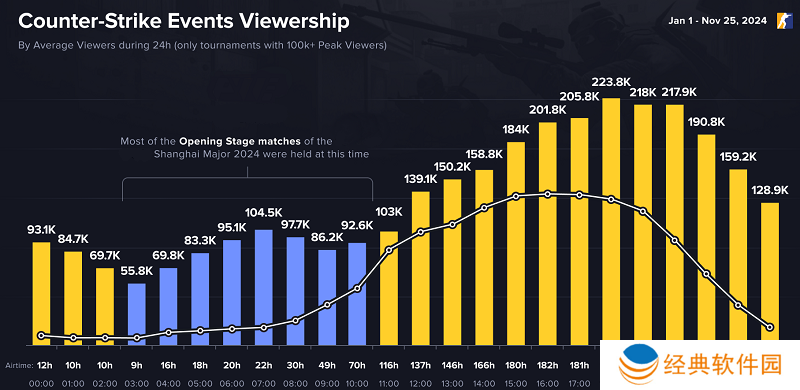 柱状图蓝**域为上海Major开幕赛阶段的比赛时间和24小时内平均观看人数(仅统计观众人数超10万的CS赛事)