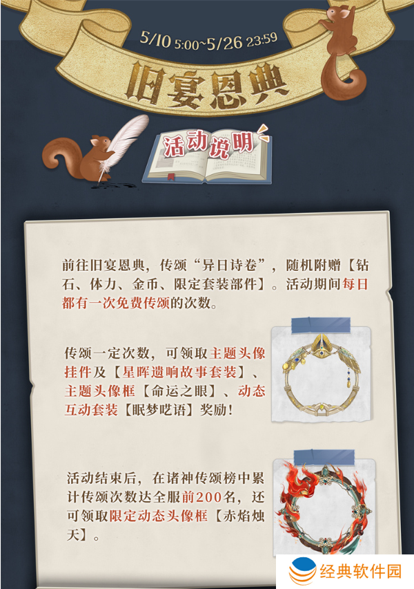 5月10日—5月26日,前往旧宴恩典,使用钻石或“诸神秘传”进行传颂,将随机附赠【钻石、体力、金币、限定套装部件】。活动期间每日都有一次免费传颂的次数。
