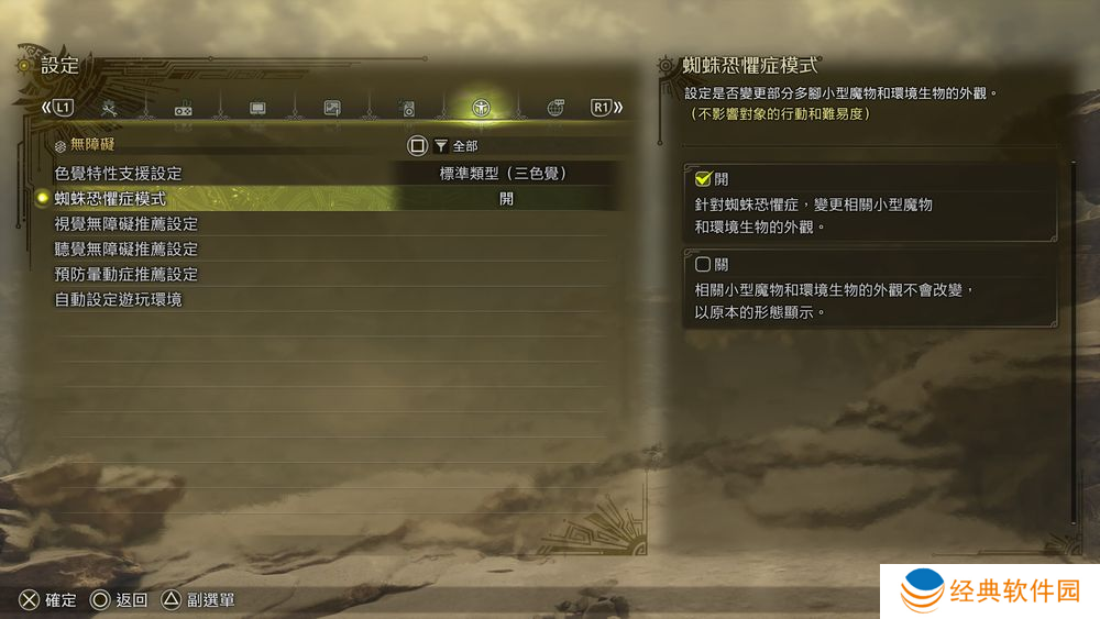 在游戏一开始的设定选单里即可看到,本作新增了一项名为「蜘蛛恐惧症模式」的功能。此功能开启后,部分小型魔物及环境生物的外观将会改变,让害怕蜘蛛或昆虫等生物的玩家可以安心游玩。