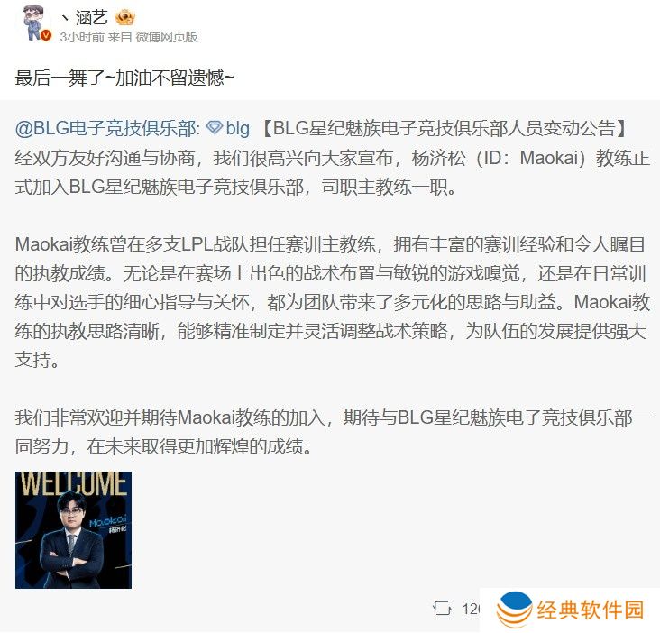 直播吧12月6日讯 BLG电子竞技俱乐部官宣了Maokai教练的加盟,媒体人涵艺发文:“最后一舞了~加油不留遗憾~”