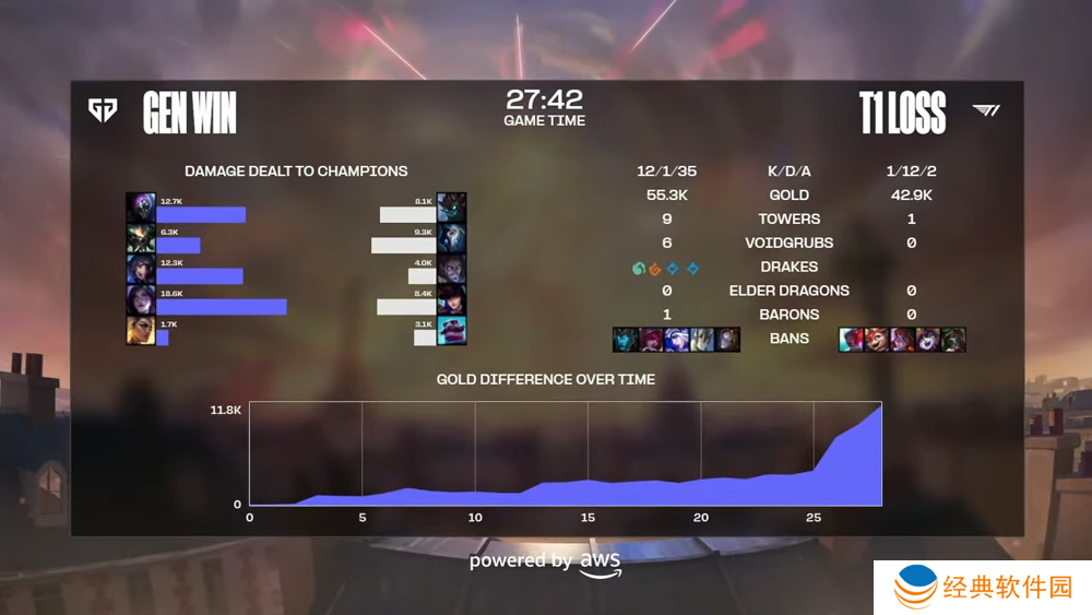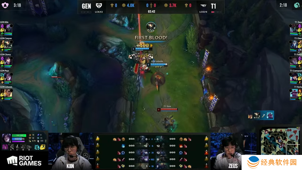 第一局 T1 选择蓝方、首抢犽凝。2 分钟 GEN 三人想越塔抓 Zeus 失败,T1 掌握住前期换缐节奏。T1 拿到三条虚空幼虫、GEN 则交换拿下第一条小龙。11 分钟 GEN 抢下最后一只幼虫并成功首杀 Oner。15 分钟 GEN 吃掉预示者并杀掉 Keria,GEN 持续交换到资源,经济开始领先。23 分钟 T1 快速吃下巴龙,Faker 来防守的 GEN 果断开战,T1 打出一换三,T1 三路推进并在高地前击杀两名对手,T1 经济领先五千。28 分钟阻断 GEN 抢龙魂,Gumayusi 漂亮开射、T1 ACE 对手后直上高地、30 分钟攻破主堡,T1 拿下第一分。