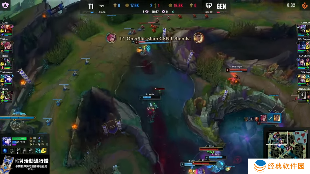第二局 GEN 选择蓝方,T1 拿茂凯、镜爪、赛勒斯、凯特琳、布朗姆等控制防守阵容,GEN 则拿出冲排阵,3 分钟 GEN 前期快速抓到对手双人缐位置后,四夹对手拿到首杀两颗人头。GEN 前期取得六虫与水龙等所有资源,并且击杀对手三人,GEN 前期取得约两千经济的优势,20 分钟 GEN 拿到第三条小龙,GEN 在各缐给予压力,T1 陷入劣势。24 分钟 GEN 击杀 Keria 后稳稳吃下巴龙并在会战取得胜利后,并拿到龙魂后攻破对手主堡,GEN 扳回一成。