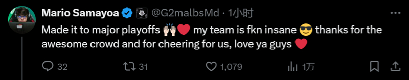 malbsMd:打进Major淘汰赛了!我的队伍太棒了,感谢超棒的观众为我们加油,谢谢你们。