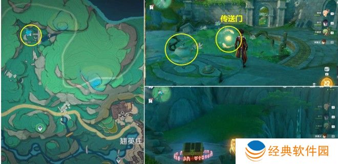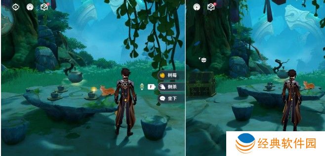2、再前去到下图地图标点位置,到石桌面前挑选【倒茶】,从传送门抵达宝箱的位置。