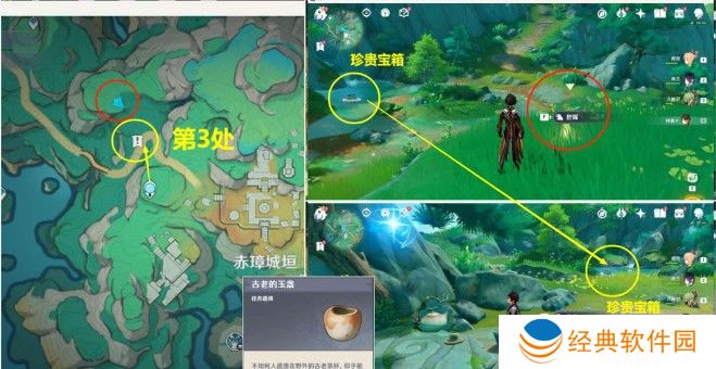 1、前去到【赤璋城垣】位置,发光点发掘获得【古老的玉盏】,抵达有图黄圈位置,在石桌面前挑选【放置】;