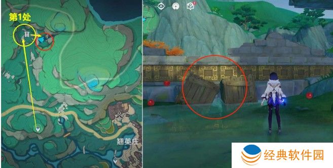 1、先前去到【赤璋城垣】地图标点位置,靠近右图石头消失,在石头会有一把剑调查出现岩龙蜥战胜;
