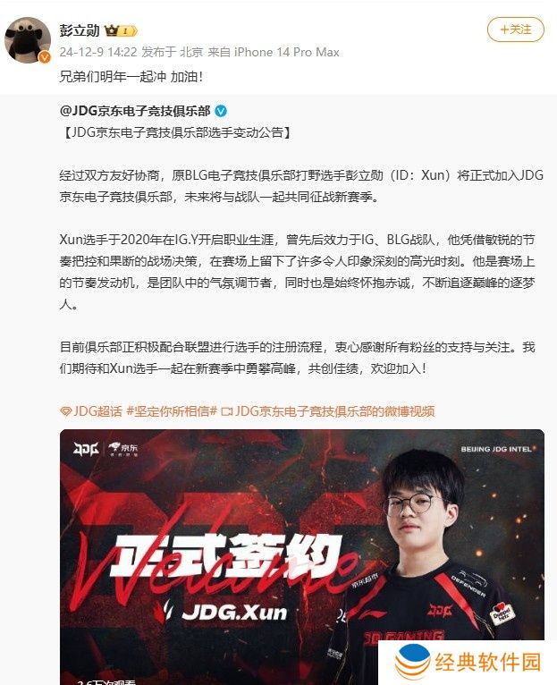 直播吧12月9日讯 今日JDG官宣打野选手Xun加盟,随后Xun转发该微博并配文:兄弟们明年一起冲 加油!