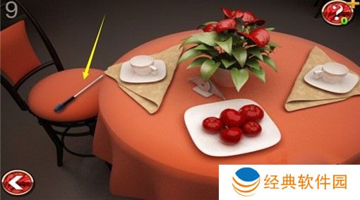 1、进入第九关,我们来到右边的桌子处,把椅子拉开,可以发现椅子上面放着一把螺丝刀,把它收集起来。