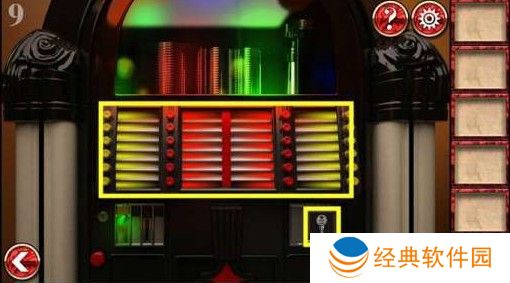 6、将这枚硬币投入右边的老 虎 机里,然后快速点击灯泡,使所有的灯泡同时亮起时,就能得到钥匙了。我们最后用钥匙打开门就可以通关第九关了。