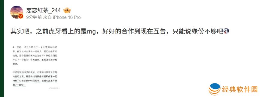 直播吧12月10日讯 近期iG官宣了重组,并组建了全神班阵容,氧望体育创始人安杰也接受了国内媒体的专访。对于专访的内容,恋恋红茶感慨到,此前虎牙在投资iG之前是投资RNG,两个战队从好好合作到现在对簿公堂,只能说缘份不够吧!