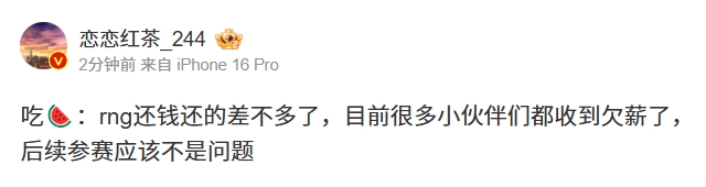 直播吧12月11日讯 此前RNG被爆出欠薪过多,联盟要还清欠款否则无法注册选手,也无法参加2025年的LPL。今日恋恋红茶爆料RNG还钱以及还的差不多了,目前很多小伙伴们都收到欠薪了,后续参赛应该不是问题!