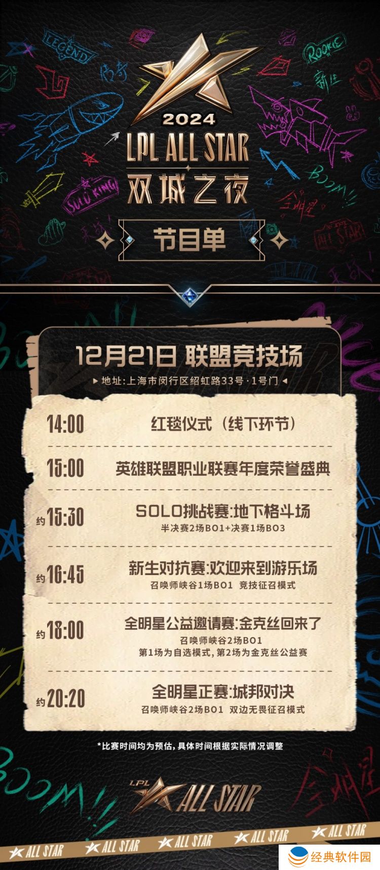 直播吧12月11日讯 2024英雄联盟职业联赛全明星-双城之夜将于12月21日举行。全明星-双城之夜日程安排以及节目单如下: