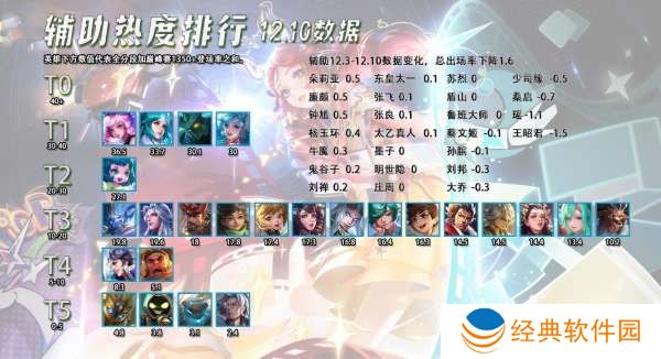 辅助这个星期因为没有相关改动,所以出场率的波动非常小,王昭君的出场率越来越低,最近也不常见到走辅助位的了,估计用不了多久就会把她从辅助排行榜中踢出去。