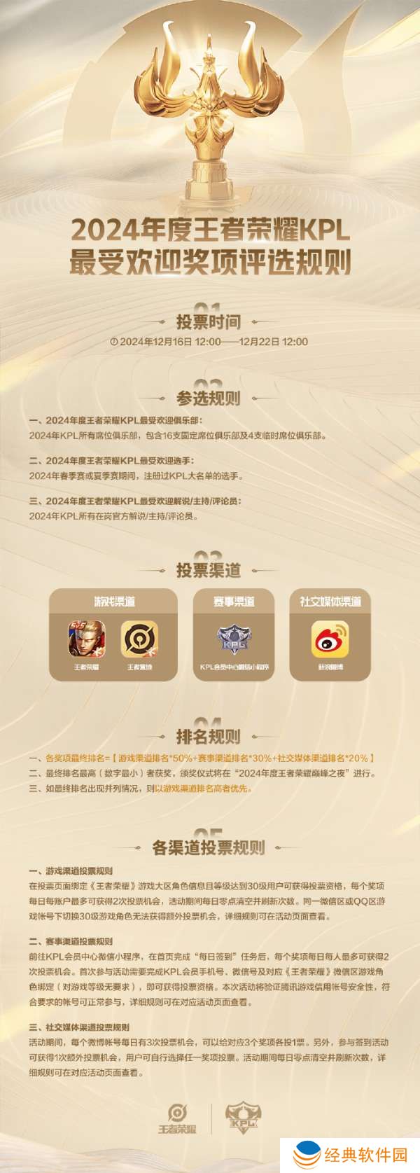 各奖项最终排名=游戏渠道排名*50%+赛事渠道排名*30%+社交媒体渠道排名*20%,最终排名最高(数字最小)者获奖,颁奖仪式将在“2024年度王者荣耀巅峰之夜”进行。