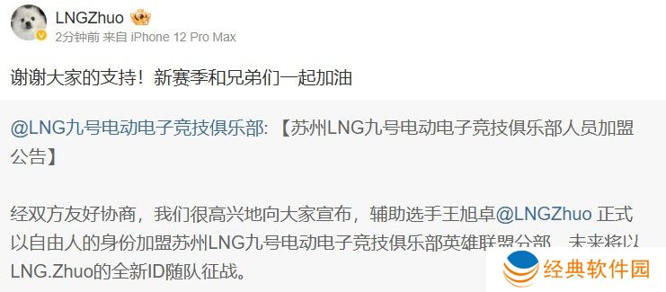 直播吧12月12日讯 Zhuo选手转发LNG人员变动公告,并配文:谢谢大家的支持!新赛季和兄弟们一起加油!