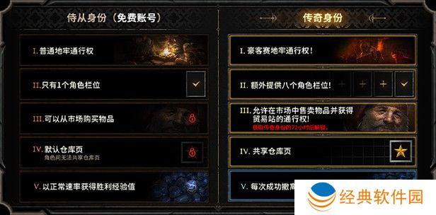 《至暗时刻》的免费版本允许玩家创建一个角色并在所有地图的普通模式中进行游戏,完成任务并积累战利品!如果玩家享受免费版本的体验并希望体验更丰富、更具挑战的游戏内容,可以通过消耗15个红石碎片(约合30美元)升级到“传奇身份”。“传奇身份”包括进入高级模式的权限,在该模式中,玩家可以装备他们辛苦获得的装备,挑战更危险的地牢,提升游戏的刺激感。此外,玩家还将获得完整的市场访问权限,可以与其他冒险者进行交易,拥有9个角色槽位,以及共享储物箱!