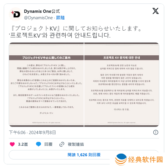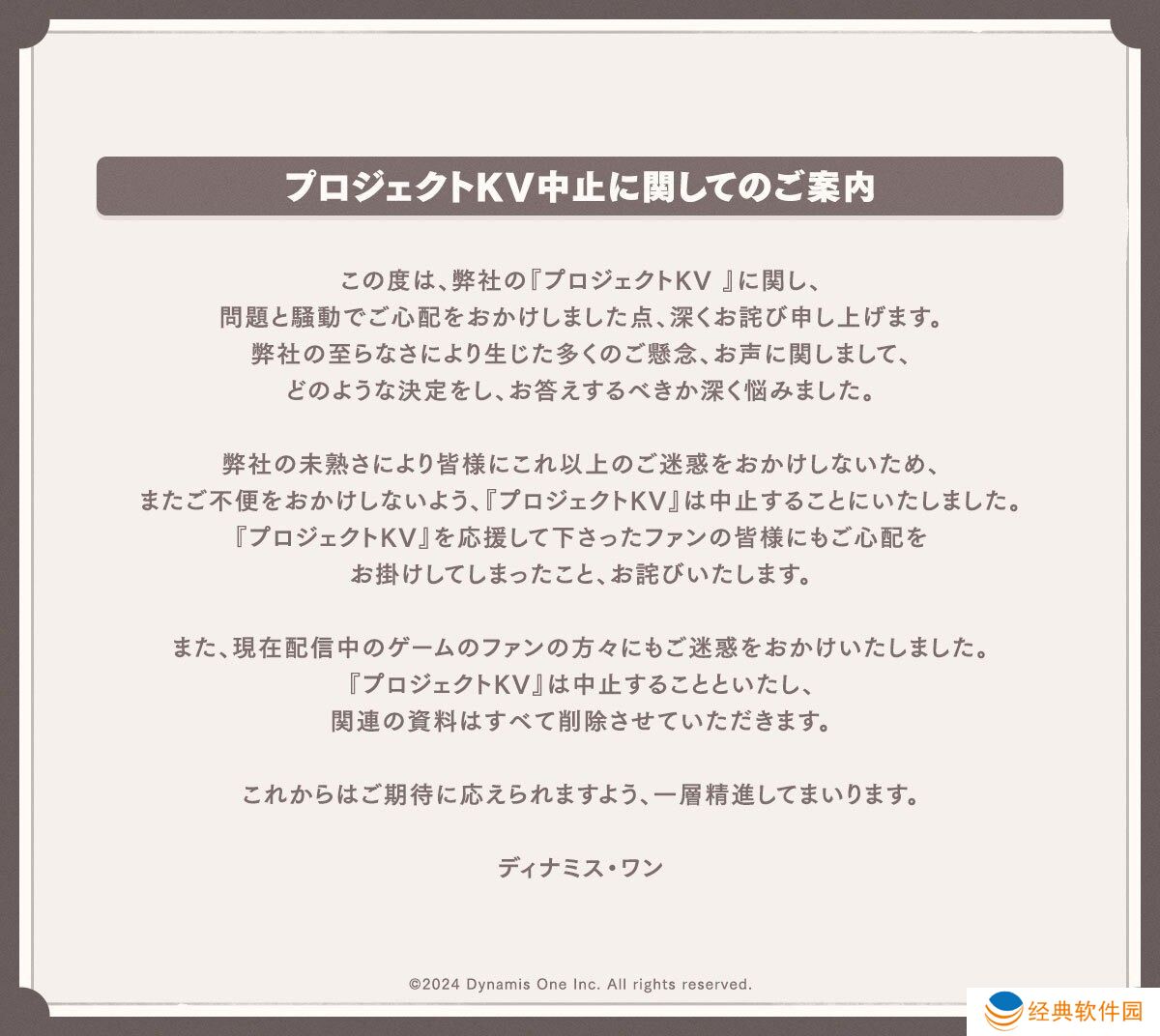 然而就在今日,Dynamis One 发表一篇公告表示《Project KV》将中止开发的消息。公告中指出,对于近日《Project KV》衍伸许多问题并造成骚动,他们感到非常抱歉。为了避免公司经验不足,导致造成更多困扰以及问题,在深思熟虑后决定中止《Project KV》,关联素材将会全部删除。
