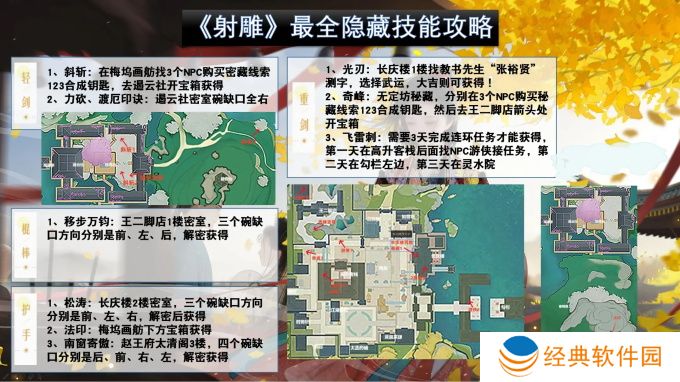 1.射雕斜斩隐藏技能:在梅坞画舫找3个NPC购买密藏线索123合成钥匙,去遏云社开宝箱获得。