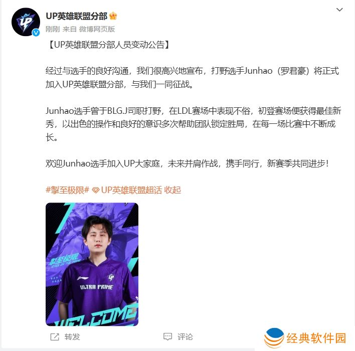 直播吧12月13日讯 UP俱乐部官宣了前BLG二队打野选手Junhao加盟的消息,这位小将此前征战于LDL赛事。