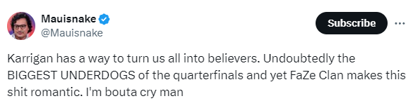 “karrigan有办法让我们都变成他的信徒。毫无疑问,FaZe是本次上海Major四分之一决赛队伍中最不被看好的一方,但他们却让这一切变得浪漫起来。 我要哭了。”