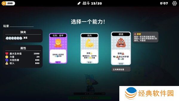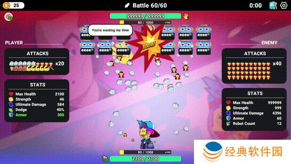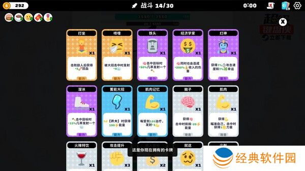 每打败一个敌人就可以选择一个能力,每个能力有不同的方式强化你的攻击或者防御,有些能力会改变你的攻击方式,比如扔便便降低对手攻击,用吸血鬼窃取生命,扔油之后点火等等。在攻击的同时还会不断积攒大招能量,在你的血量见底之前是用大招逆转战局!普通攻击和大招都会自动释放无需操作。战斗失败也并不是游戏的结束,调整策略再试一次,说不定这次就会有逆天组合!