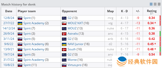 donk6-17-1140.20.36其中0.36 Rating为donk加入Spirit之后的生涯第二低,他生涯最低Rating为0.34 Rating,是在IEM科隆2024 A组败者组首轮对阵