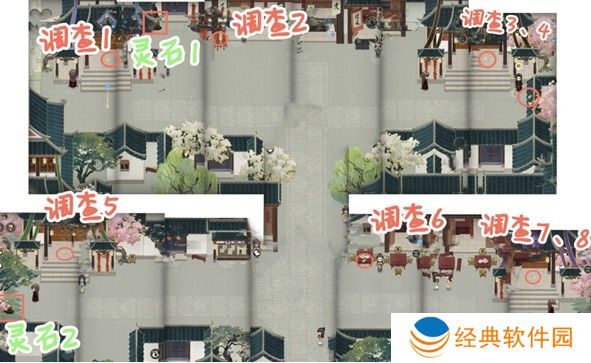 位置四:春华驻地有两处调查,两块灵石,一只灵兽;