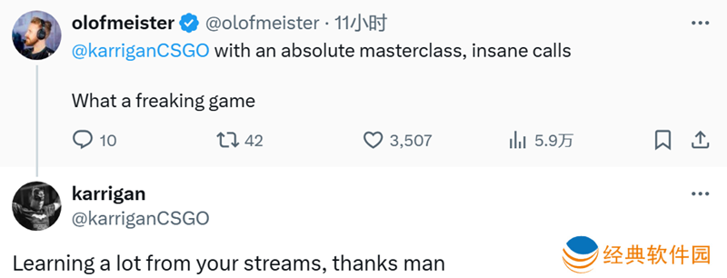 olofmeister在社交平台上称赞karrigan:“karrigan绝对是大师级的人物,指令太棒了。