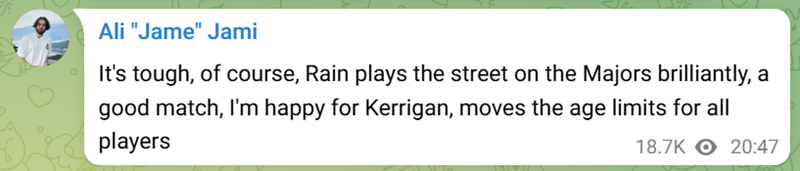 Jame也感慨道:“当然这很艰难。rain在Major的发挥很棒。这是一场精彩的比赛。我也为karrigan而高兴,他改变了所有选手的职业年龄上限。”