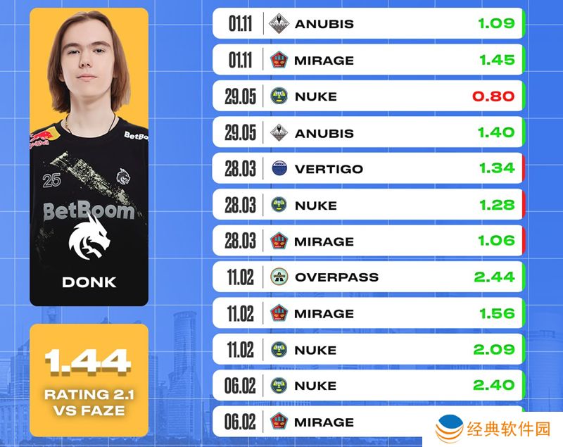 donk在今年对阵FaZe的比赛中都保持着极佳的手感,FaZe似乎始终无法找到遏制这位新星的有效办法。donk今年对阵FaZe的平均数据Rating高达1.44,其中在IEM 卡托维兹的决赛中更是打出了极为夸张的1.96 Rating。