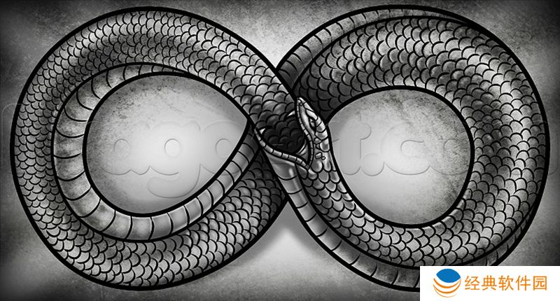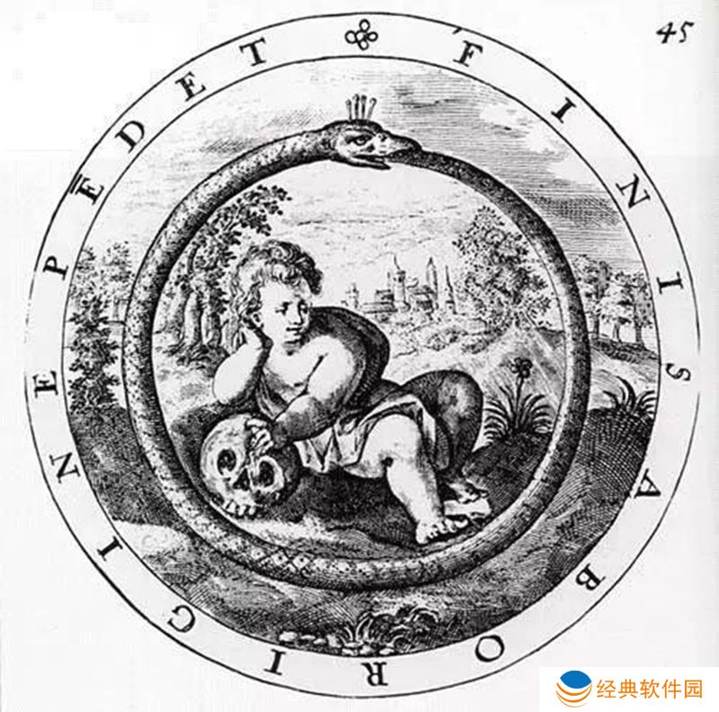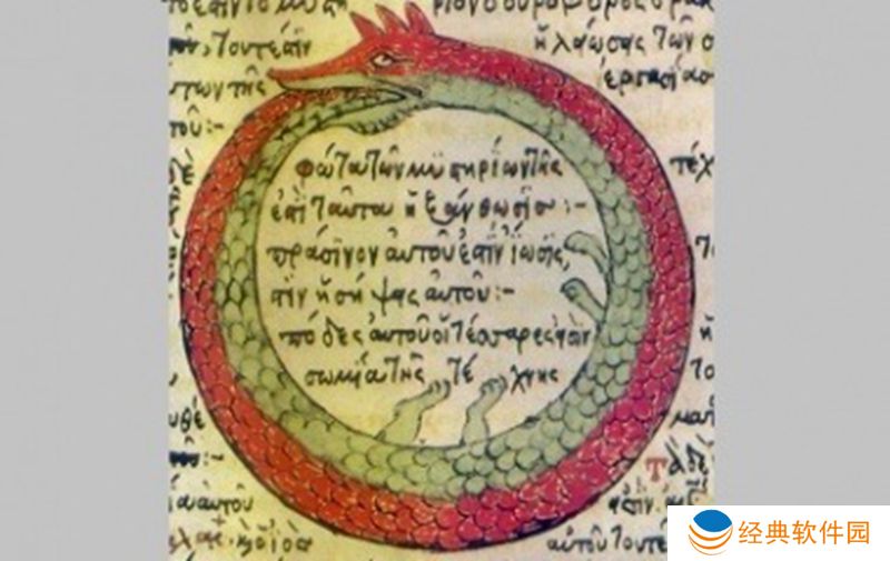 衔尾蛇是古埃及和希腊的象征性蛇,嘴里叼着尾巴,不断吞噬自己并从自己身上重生。