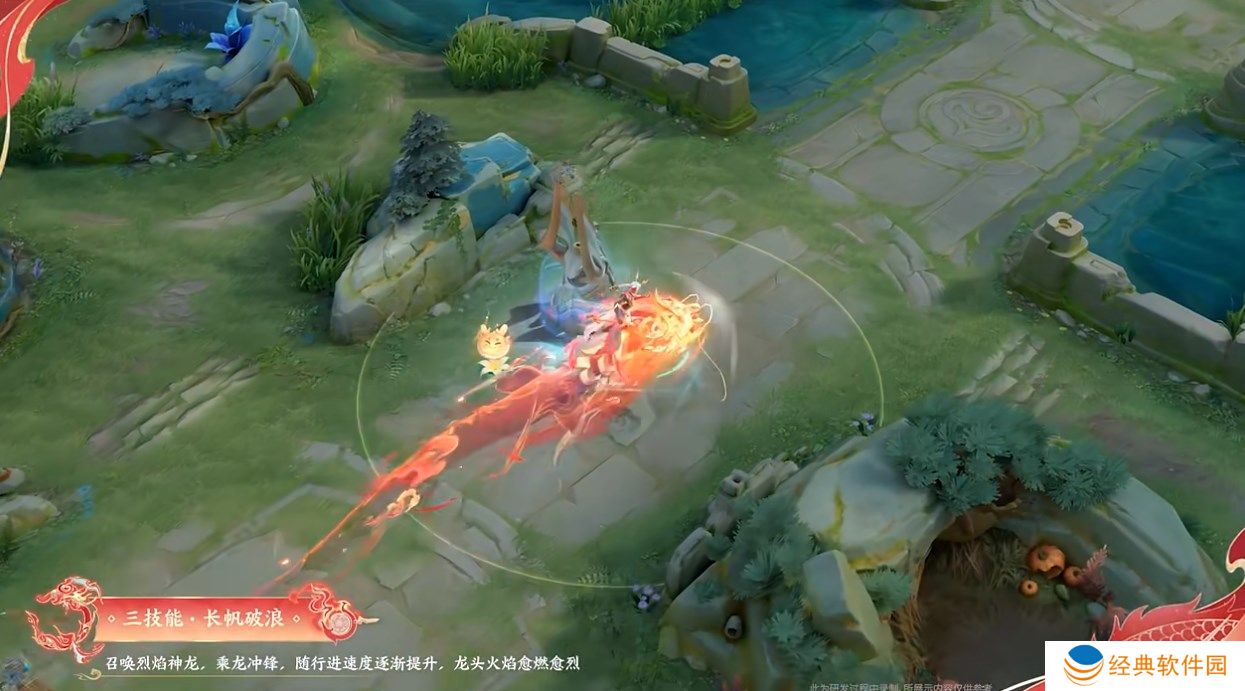 三技能:召唤烈焰神龙,乘龙冲锋,随行进速度逐渐提升,龙头火焰愈燃愈烈,命中后爆炸形成古战场随之呈现更勐烈的效果;其他4个龙限皮肤与其一同乘龙呈现不同乘龙动作