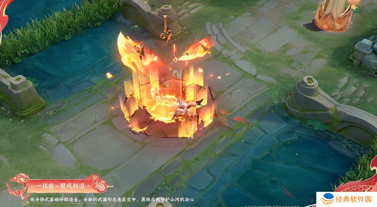 一技能:他手持武器砸碎锻造台,全新的武器形态悬在空中,展现出他守护山河的决心