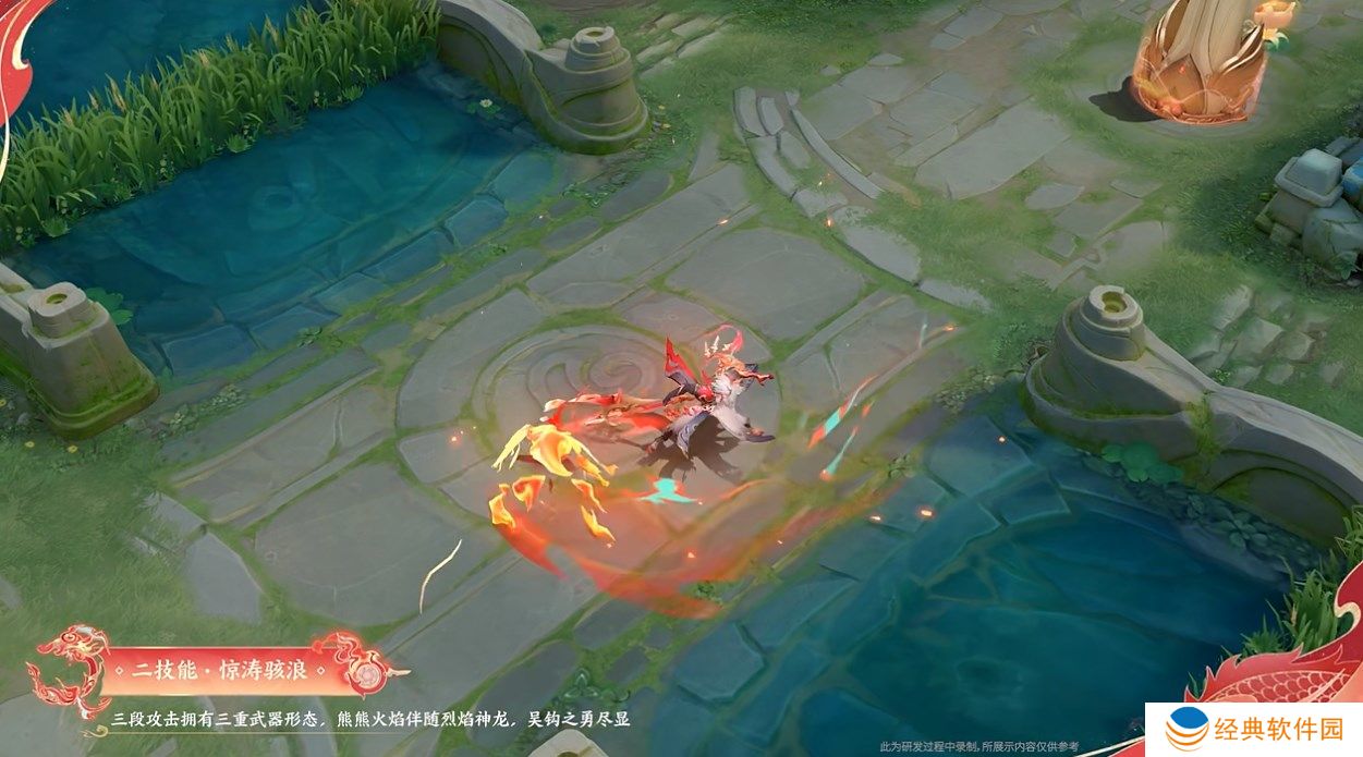 二技能:三段攻击拥有三重武器形态,熊熊火焰伴随烈焰神龙,吴钩之勇尽显
