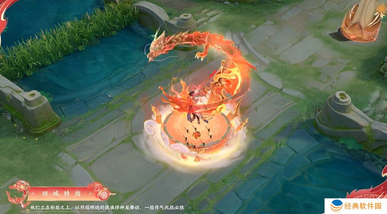 回城特效:他伫立在彩鼓之上,以烈焰燃烧的战斧指引神龙舞动,一鼓作气此战必胜