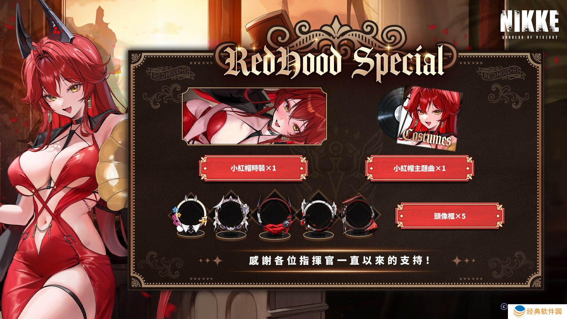 再次感谢指挥官对妮姬的支持,作为奖励的头像框和小红帽时装、小红帽角色主题曲,即将透过游戏内【Redhood special】活动发放。