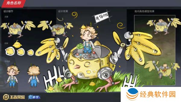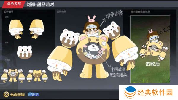 接下来我们再来看刘禅的第二个设计图,这款皮肤名为甜品派对,刘禅的模型是以黄色为主色调,刘禅的坐骑是玩偶形态的,肚子上面还有小熊的样子,看着特别的可爱。