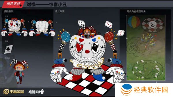 第三款名为惊喜小丑,这款皮肤也是玩具系列的皮肤,皮肤颜色是以多巴胺为主的,这款皮肤感觉作者的主体设计的有些问题,刘禅本人太小了,人偶太大了。而且因为有针角,感觉是一个破烂的玩偶。