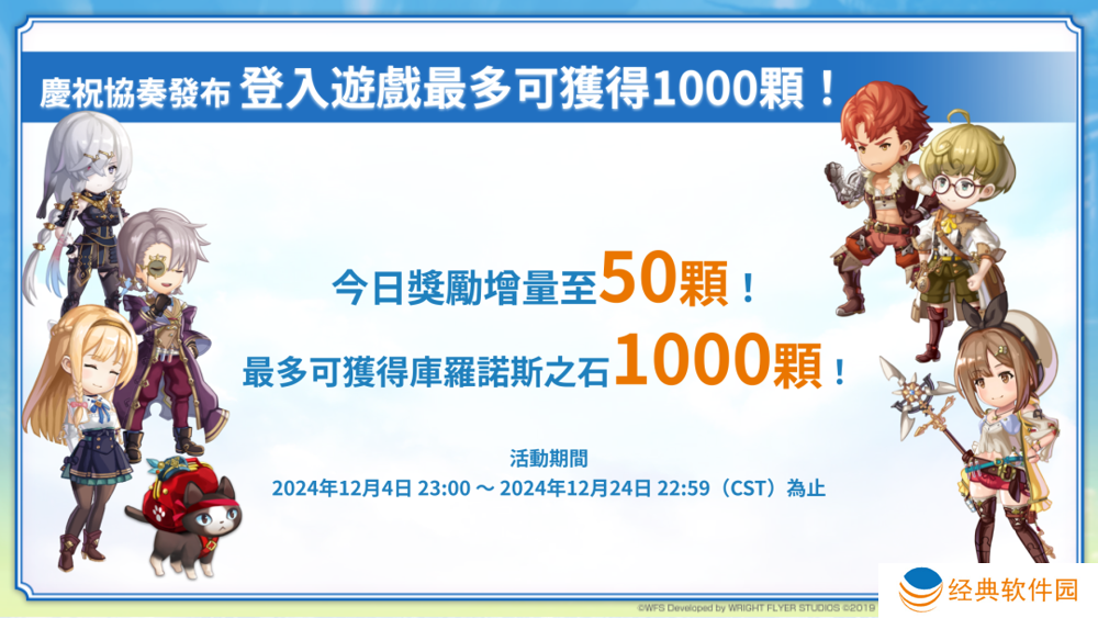 2024 年 12 月 4 日 23:00~2024 年 12 月 24 日 22:59(CST)为止,「今日奖励」的库罗诺斯之石将从 20 颗增量至 50 颗。活动期间内每天登入游戏,最多可获得库罗诺斯之石 1,000 颗。