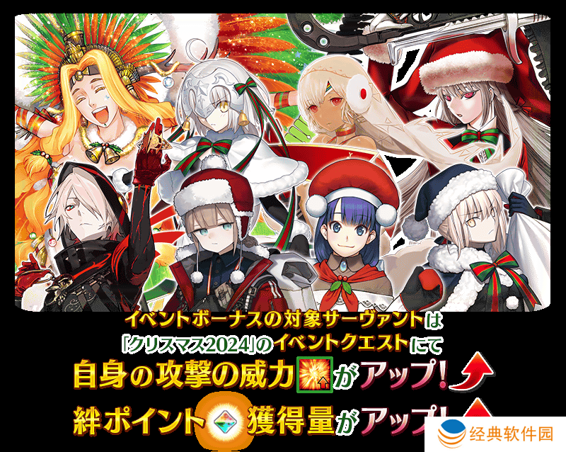 面对即将自 12 月 11日举办期间限定活动「圣诞节 2024」,率先在期间内 12 月 4 日~12 月 18 日实施举办前预热活动,内容包含了特别登入次数登入奖励、期间限定任务、活动加成从者 犟化大成功・极大成功 2 倍&羁绊获得量提升 20%。