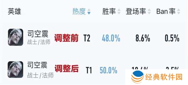 调整后仅一周时间,司空震出场率大涨10%,巅峰赛胜率从48%上涨5-%,绝对算得上一次史诗级加强。