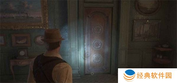 进入佩洛西的房间后,从沙发上拿起佩洛西的日记,获得谜题的提示。走进墙上挂着的画,翻开从左到右数第2幅、第3幅和第6幅画,名字应该是威廉·阿吉斯(William Arges)、弗兰克林·莫西格(Franklyn Mosig)和诺拉·基斯(Norah Keith)。来到佩洛西床边的画前,对照名字可以获得他们头上的数字,分别是2-9-4。