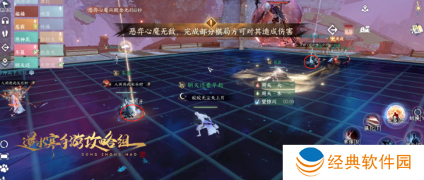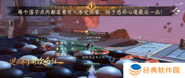 3.第一轮对弈:走落子机制,躲避会移动的黑棋攻击(红圈提示),需要大家分配好位置,不要重复落子,落子结束后BOSS虚弱,去中间放绝技输出即可。