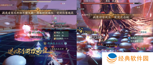 应对方式:黑棋攻击保持移动躲避;红光处召唤战虎,越晚打越脆,所以最后击杀。在金光处击杀战虎可直接复原白子,否则白子会碎成四枚需要搬运碎片复原;落子机制为第一优先级,当屏幕出现中盘掠地时会召唤第二优先级的1岁战鹰,需要集火秒杀。