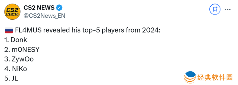 GamerLegion战队选手FL4MUS在社交媒体平台上分享了自己的2024年度Top5选手预测: