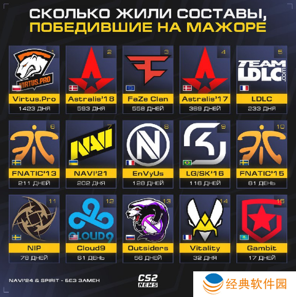 VP战队是Major夺冠队伍中维持阵容最长久的,他们在拿到2014 EMS 卡托维兹Major之后,直到1423天后才进行了第二次变阵。