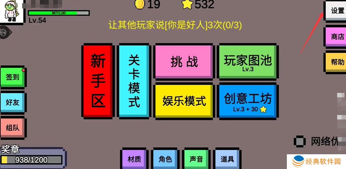 1、首先开始游戏,点击右上角的设置,进入设置页面;