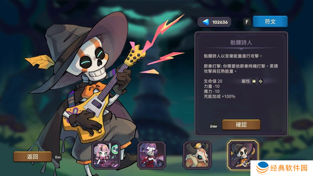 「骷髅诗人」以音乐能量进行攻击。角色的基础力量与魔力为负值,但武器充能效率 +100%,可以轻易发动各种高节拍数的武器。