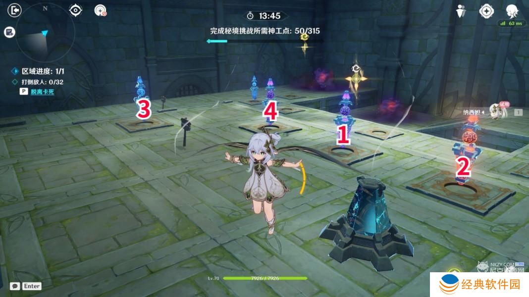 2、如图所示(编号为更新次序),摆放两水两雷一火,纳西妲站在雷塔中间,给的怪照相补草元素即可。