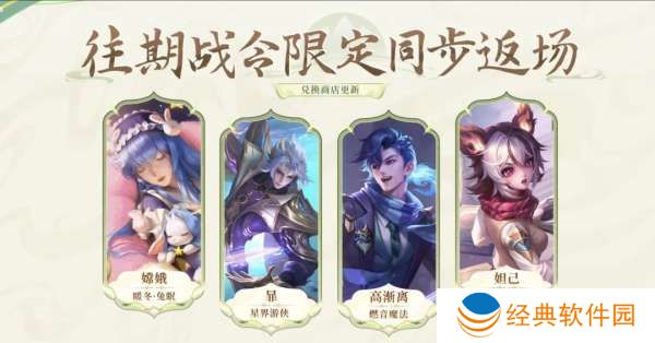 嫦娥-暖冬兔眠、暃-星界游侠、高渐离-燃音魔法和妲己-灵卜魔法,加入战令兑换商店、通过战令币购买礼包获取。